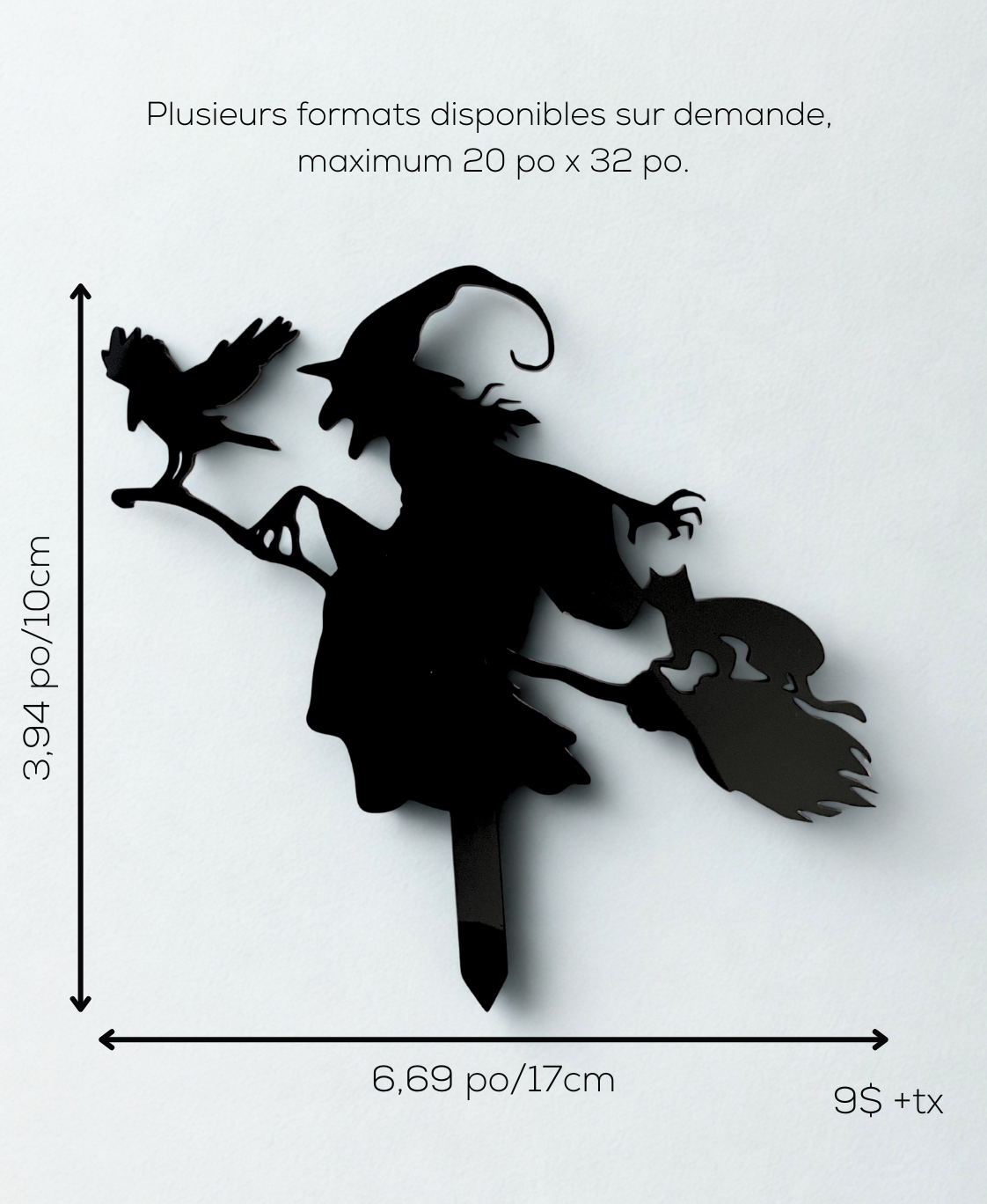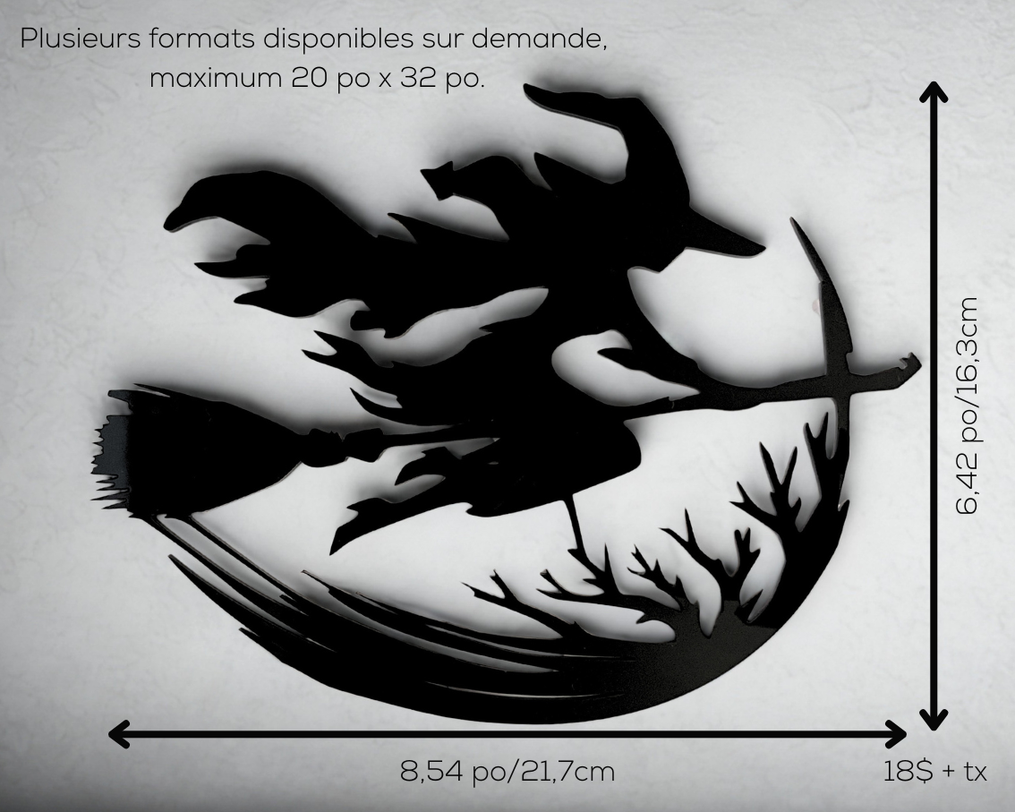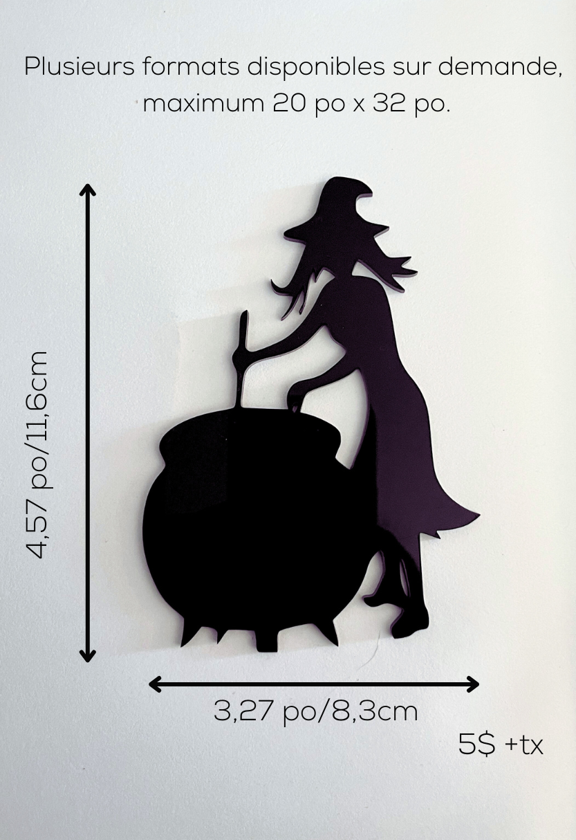 Sorcières, manoirs hantés, chats mystérieux et arbres tordus : nos modèles se déclinent en plusieurs formats — de la mini-décoration parfaite pour un coin de fenêtre, à la version géante pouvant atteindre 20 po x 32 po, idéale pour les murs, vitrines ou espaces extérieurs. Possibilité d'ajouter un piquet pour planter dans les plantes (voir modèle
