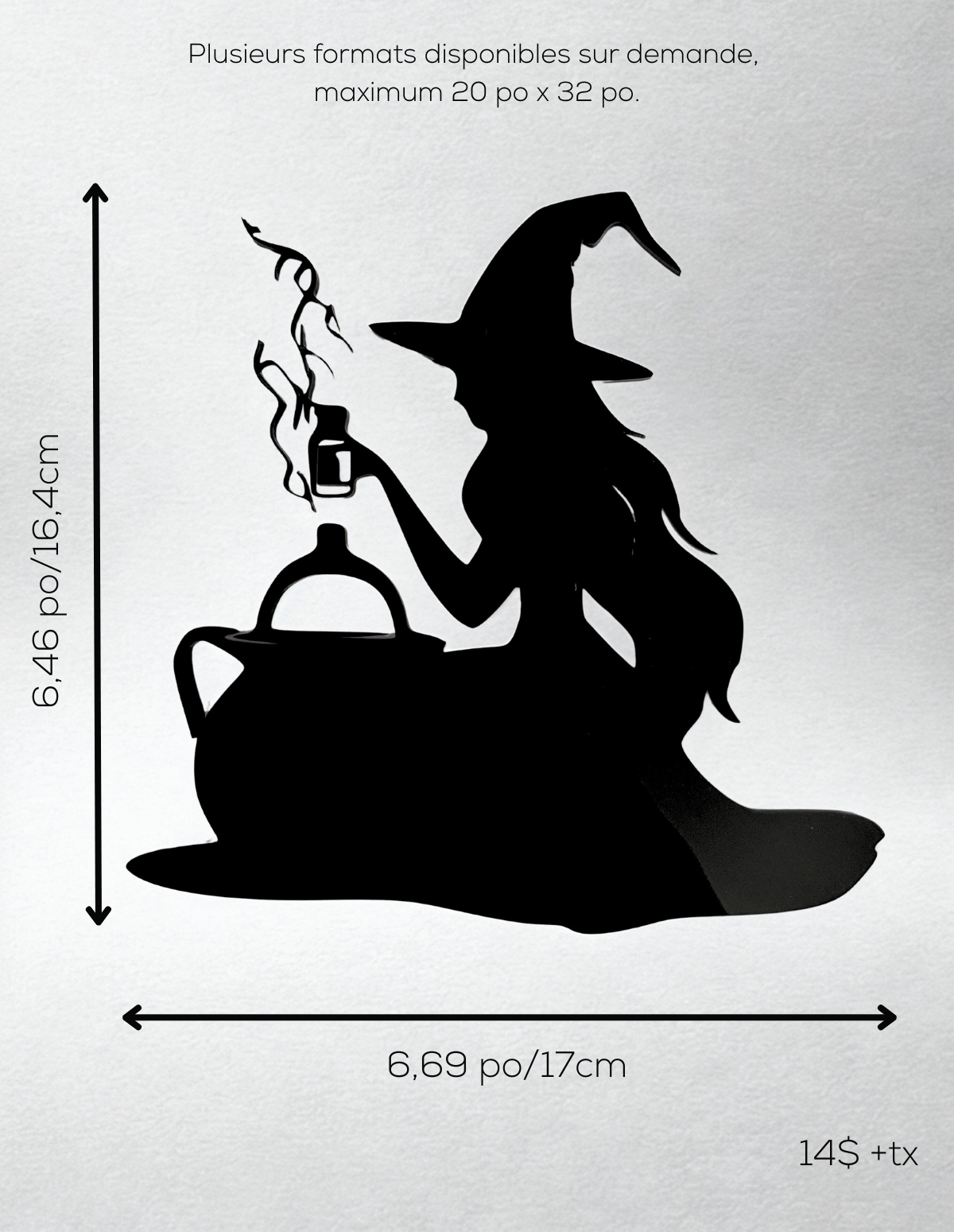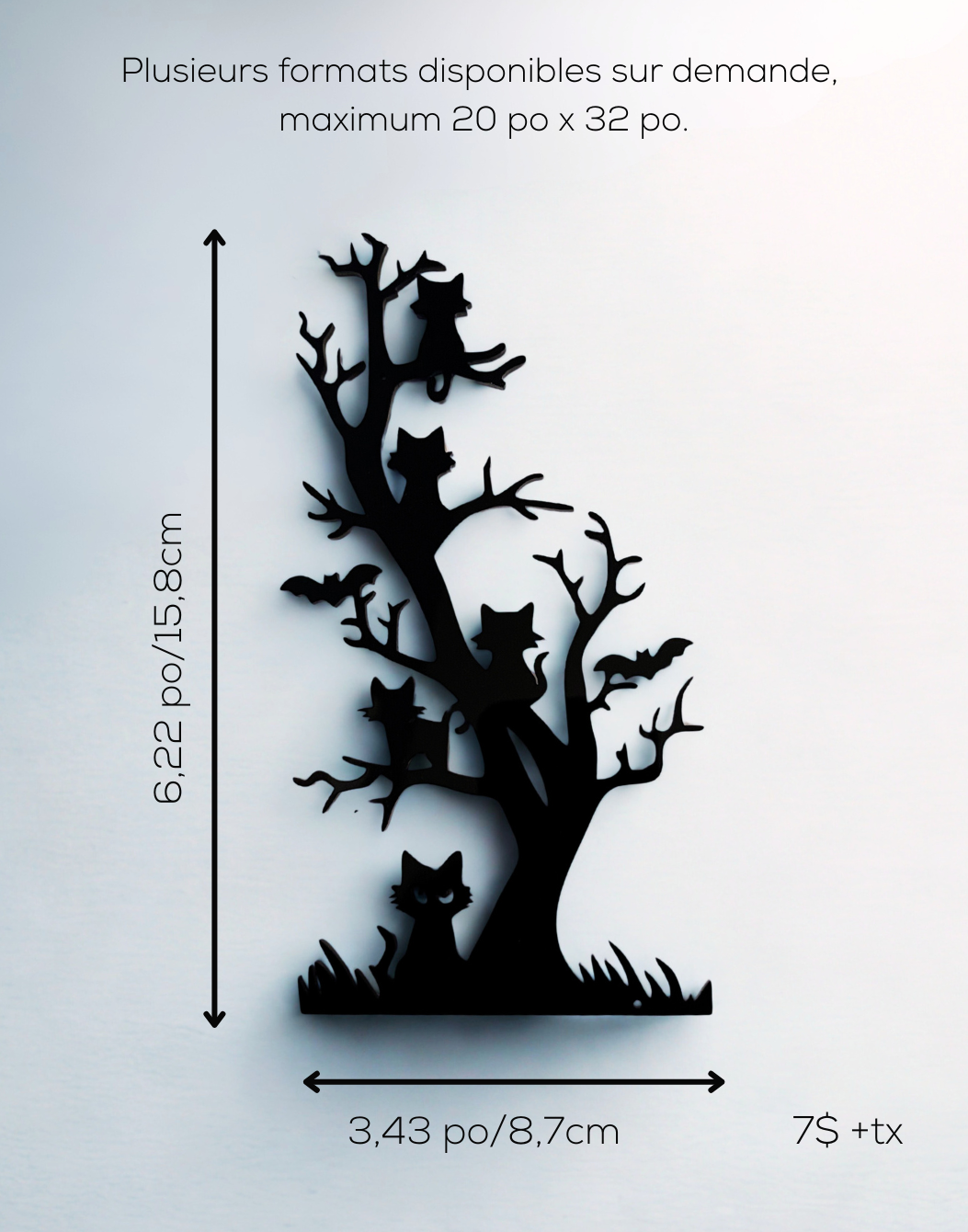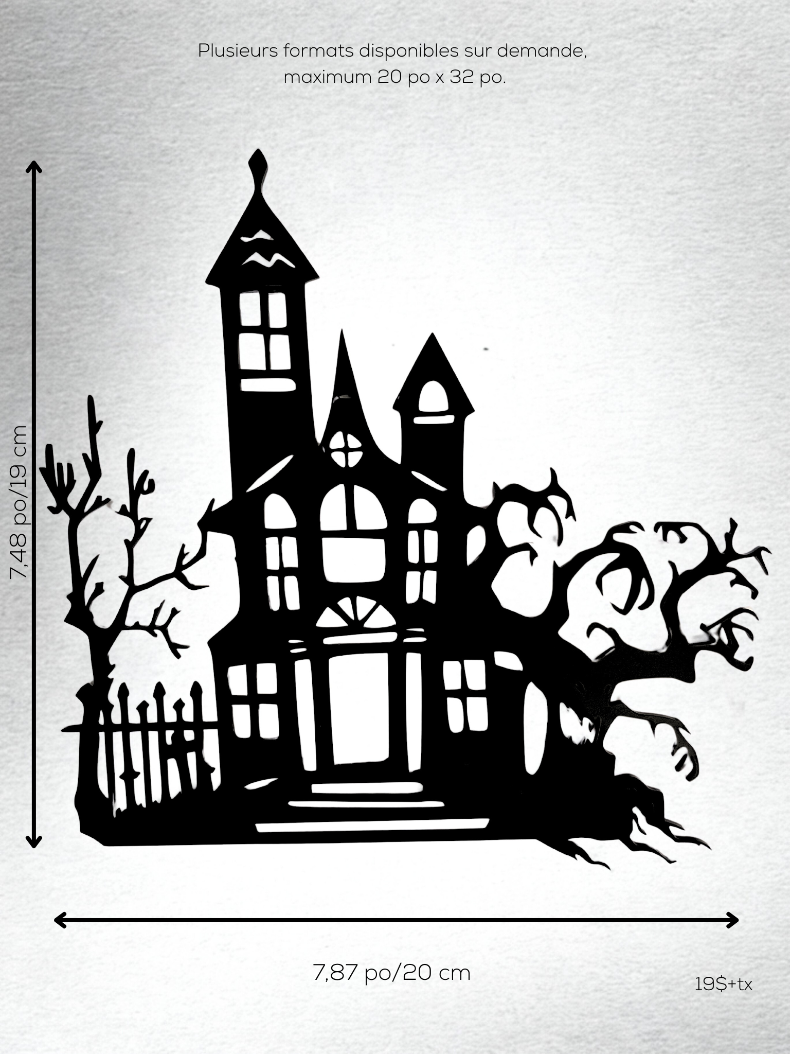 Sorcières, manoirs hantés, chats mystérieux et arbres tordus : nos modèles se déclinent en plusieurs formats — de la mini-décoration parfaite pour un coin de fenêtre, à la version géante pouvant atteindre 20 po x 32 po, idéale pour les murs, vitrines ou espaces extérieurs. Possibilité d'ajouter un piquet pour planter dans les plantes (voir modèle