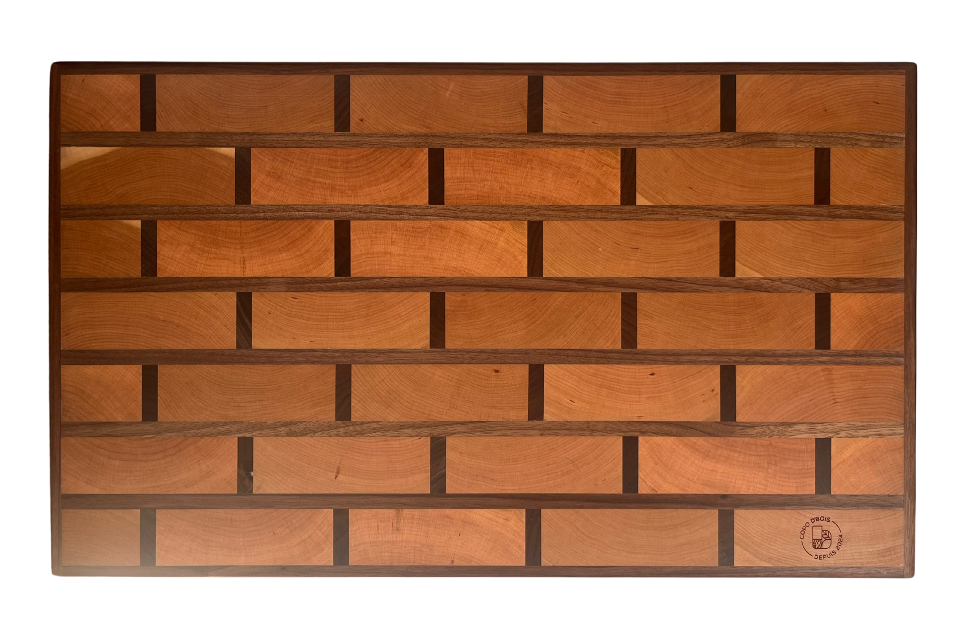Avec ses dimensions de 25"x15"2 3/4", "La Brique" impose sa présence sur n’importe quel comptoir. Son assemblage en bout de bois crée un effet visuel unique : chaque fibre est tournée vers le haut, révélant un motif naturel spectaculaire et une résistance exceptionnelle.