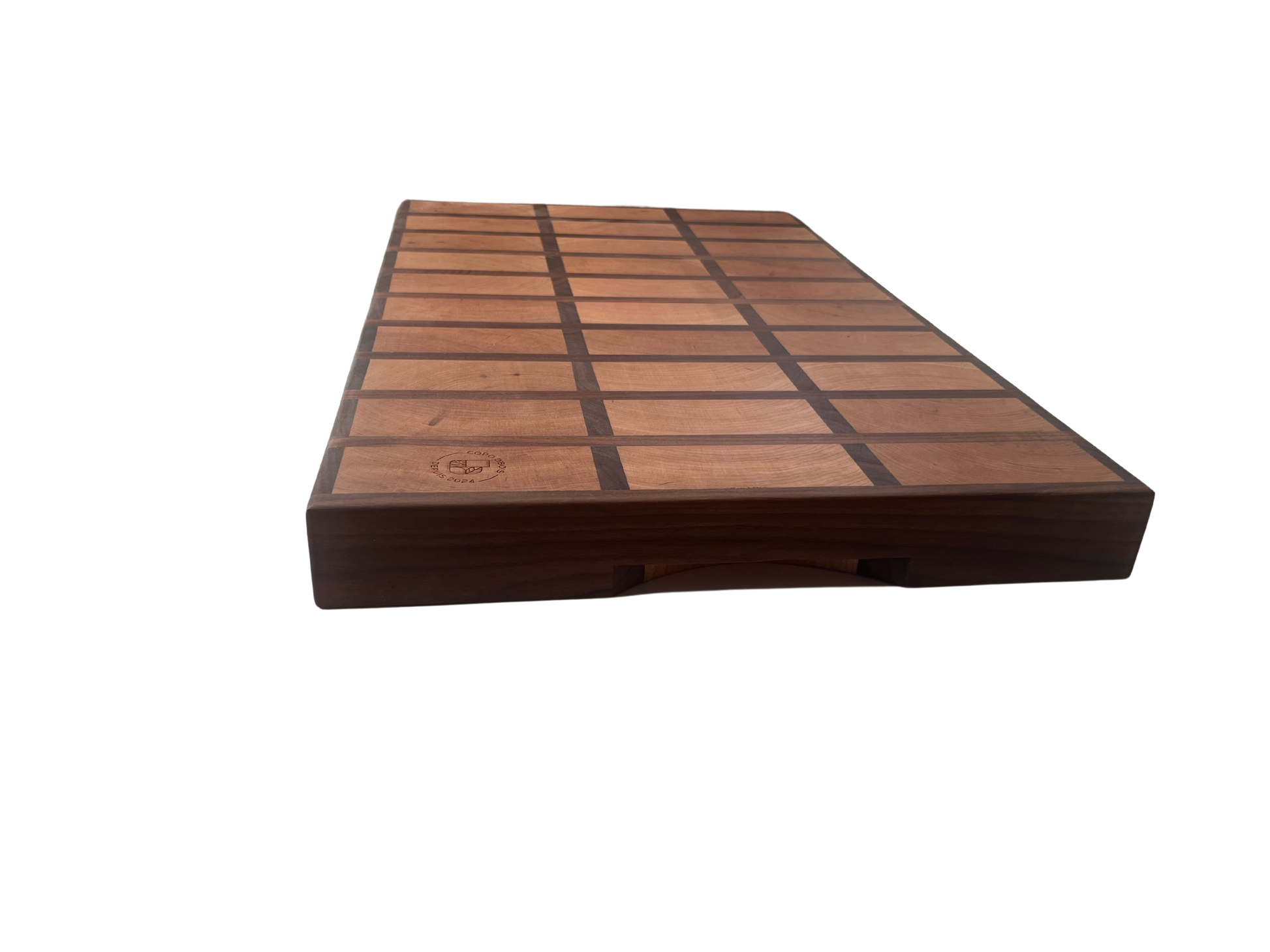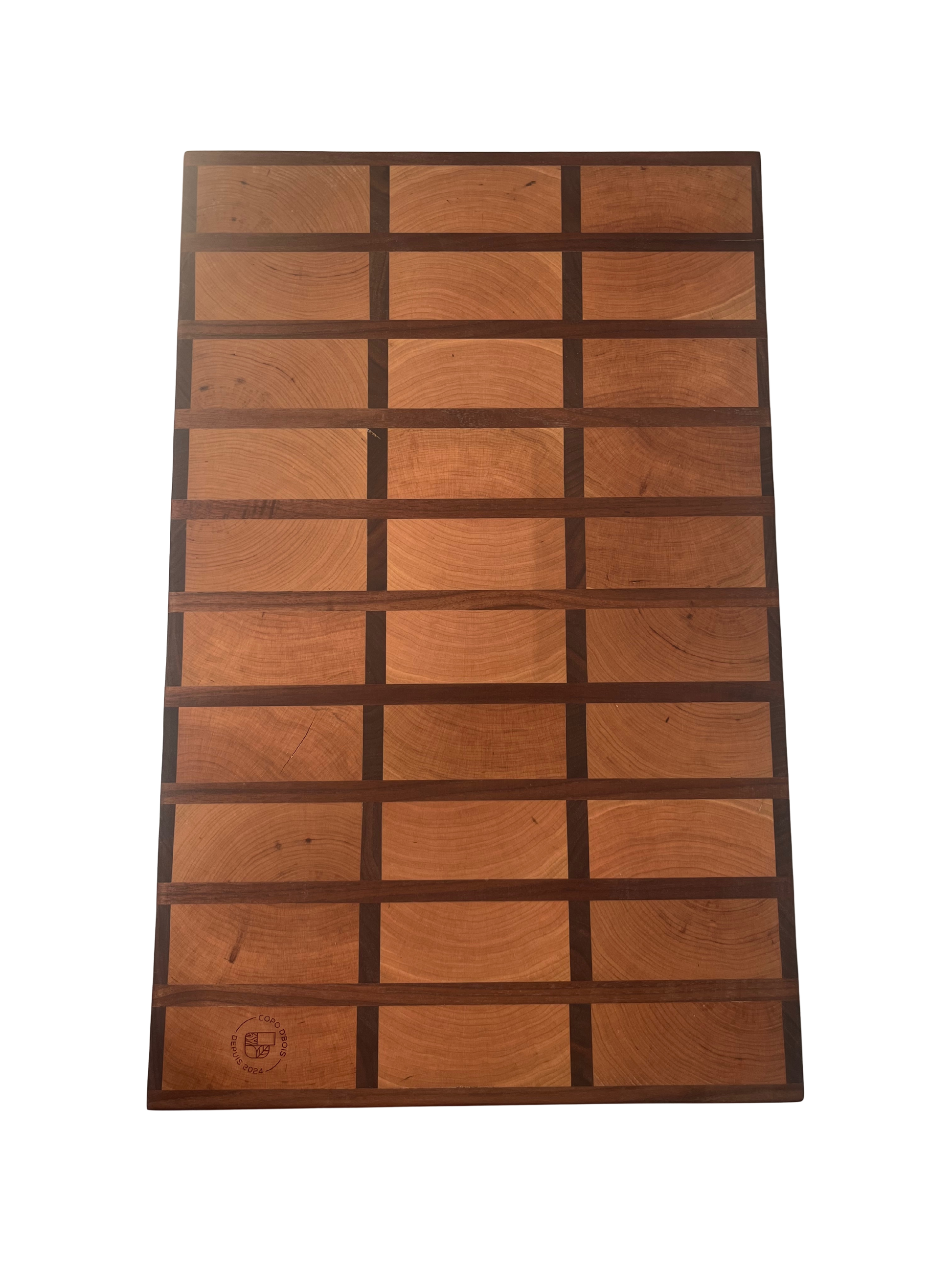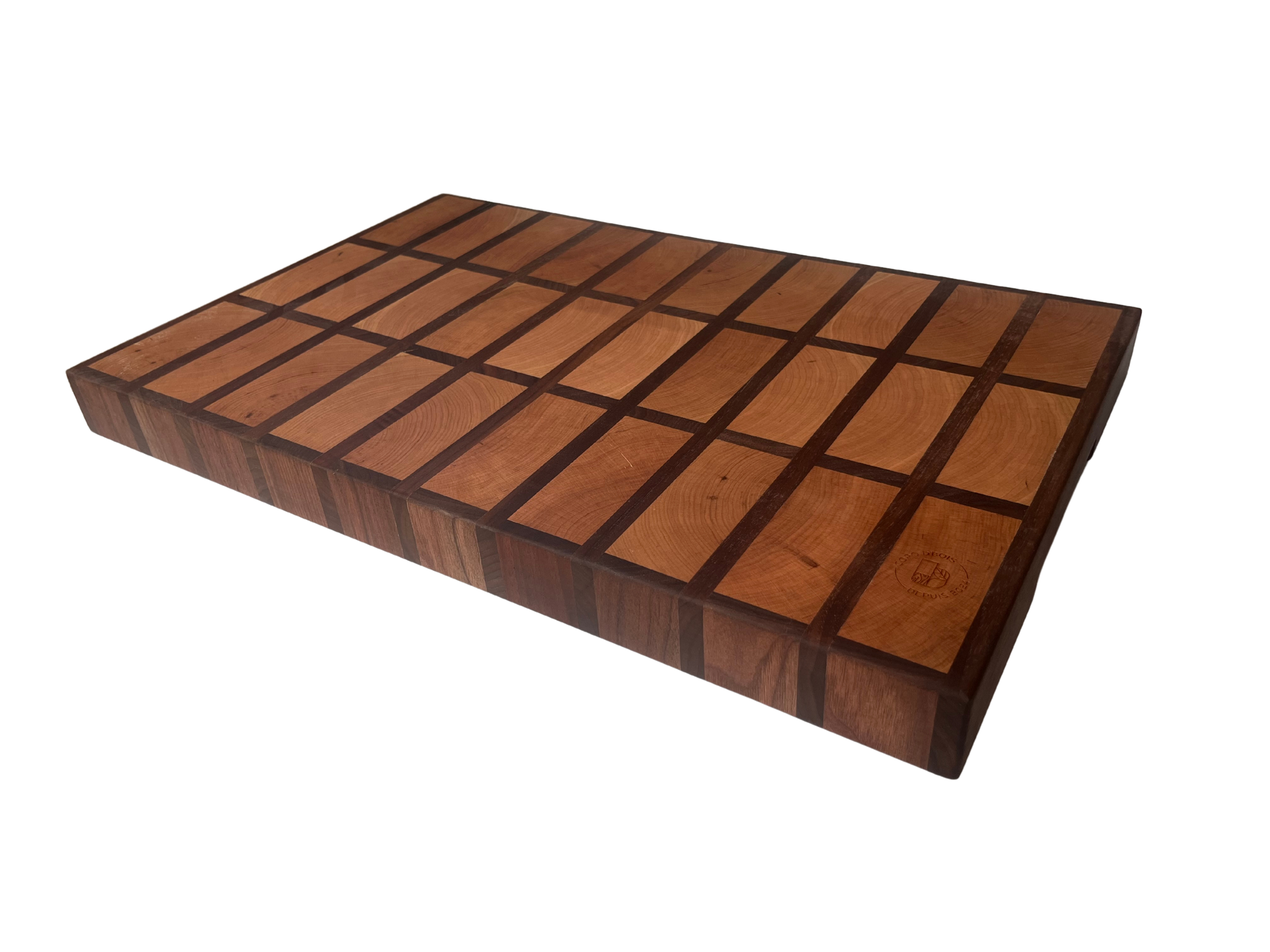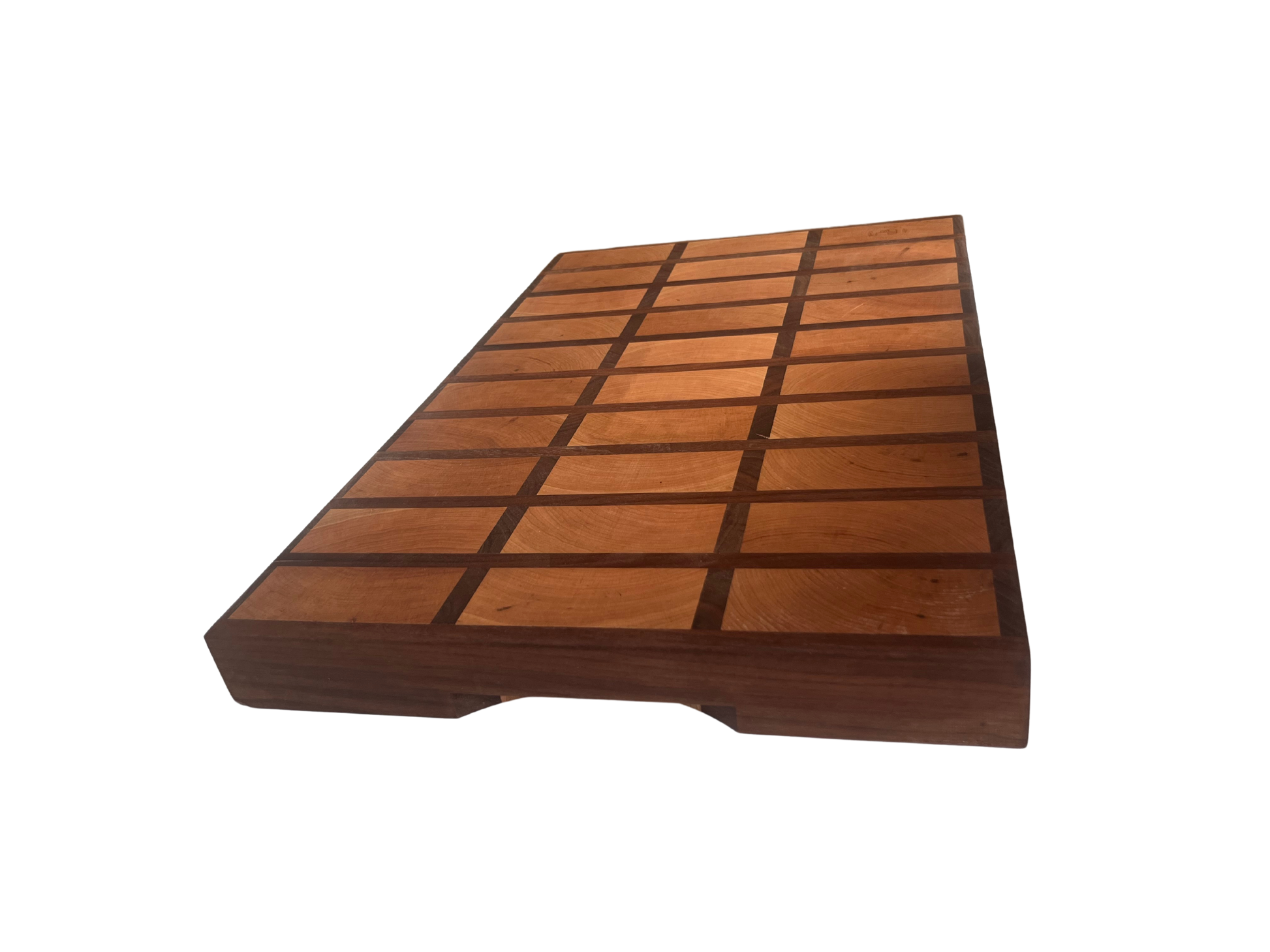 Avec ses dimensions de 23"x15"2", La Quadrillé offre un équilibre parfait entre format pratique et allure haut de gamme. Son assemblage en bout de bois met en valeur les cernes et les contrastes du cerisier et du noyer, créant un quadrillage naturel à la fois harmonieux et architectural. Chaque fibre est orientée vers le haut, assurant une stabilité exceptionnelle et une résistance hors pair.