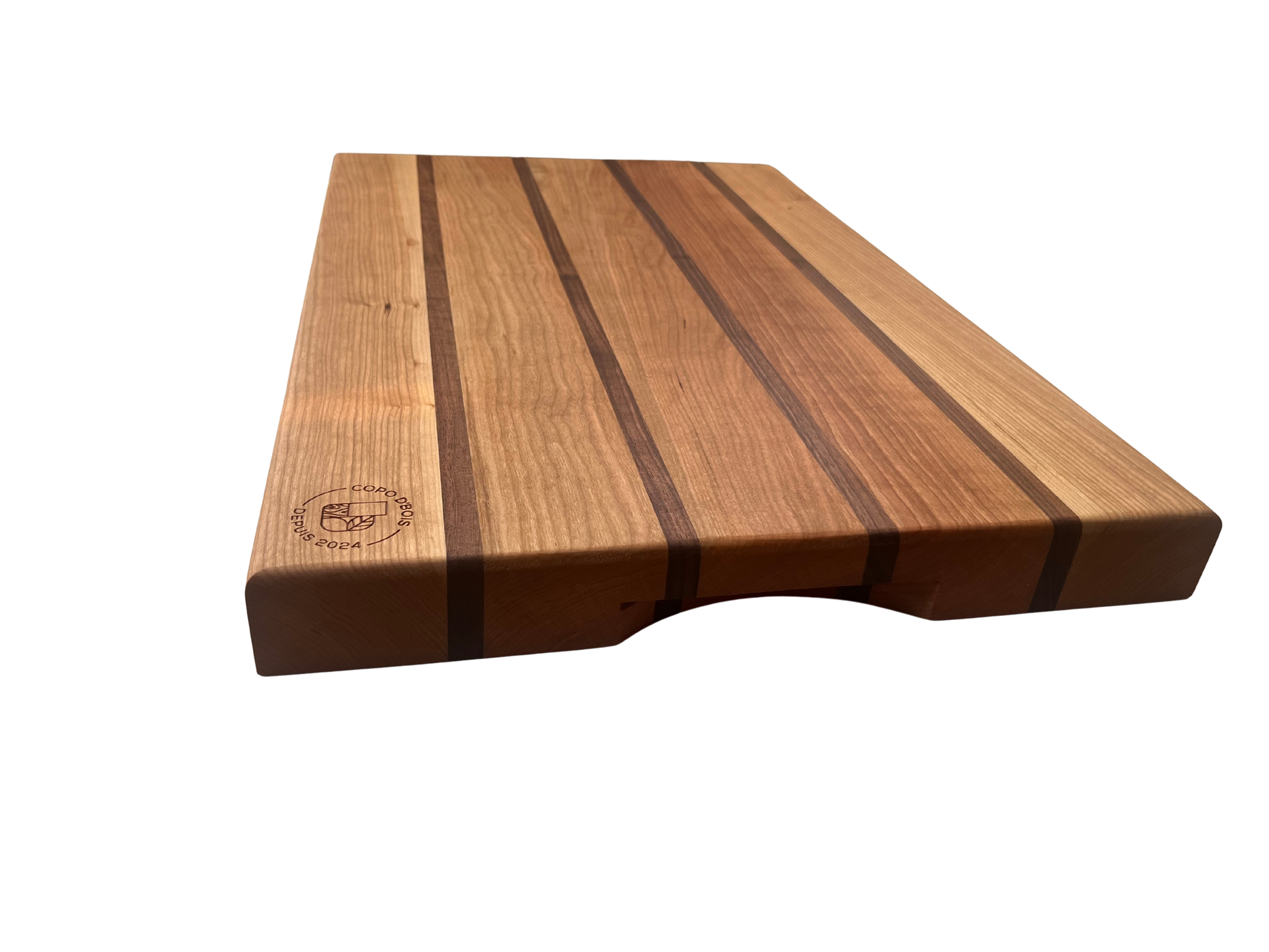 Avec ses dimensions de 23"x15"x1 3/4", La Lignée marie la chaleur du cerisier à la profondeur du noyer dans un motif rayé d’une grande finesse. Sa conception robuste et sa finition soignée lui confèrent une présence affirmée sur le comptoir, tout en préservant un équilibre visuel harmonieux.